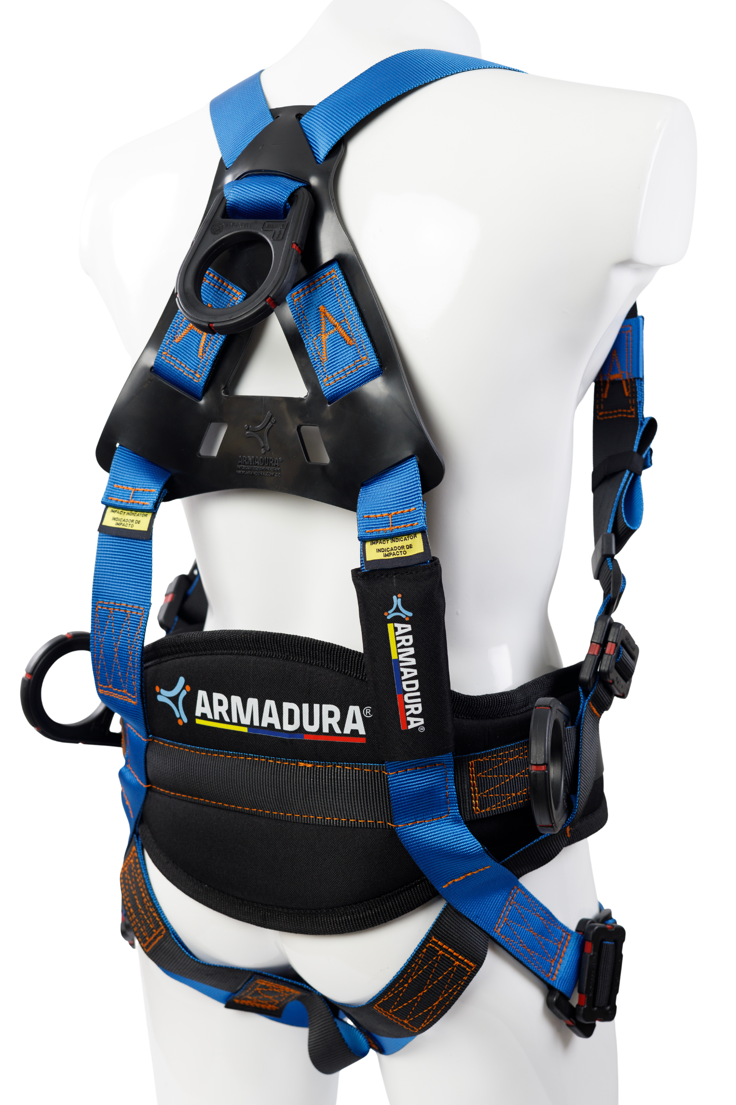Arnés multipropósito dieléctrico de cuerpo completo con diseño en H y faja lumbar. Certificado bajo norma ANSI/ASSP Z359.11-2021, con 4 argollas en acero recubiertas en nylon y resistencia dieléctrica de 9kV. Fabricado en reata poliéster bicolor azul y negro.