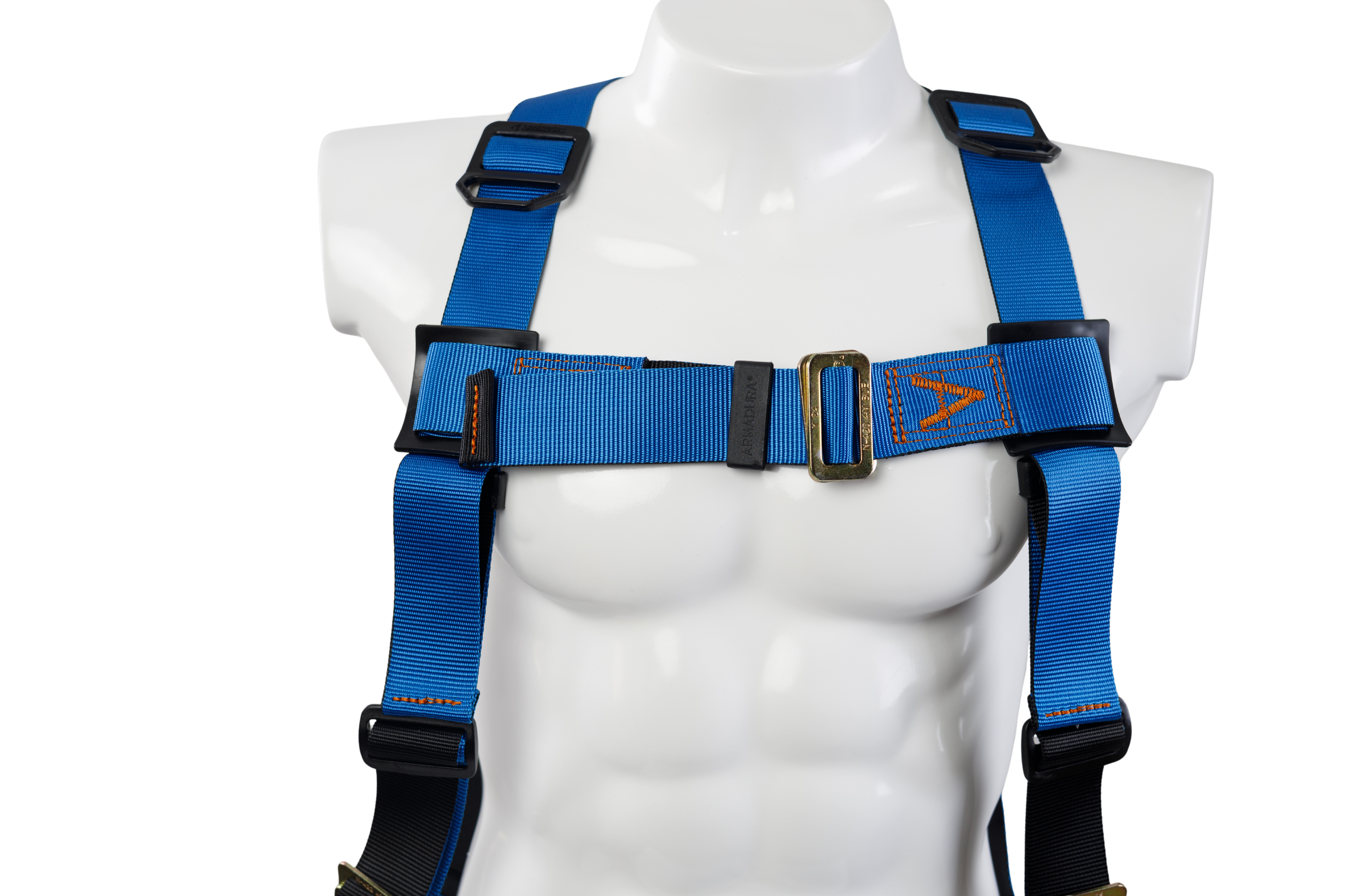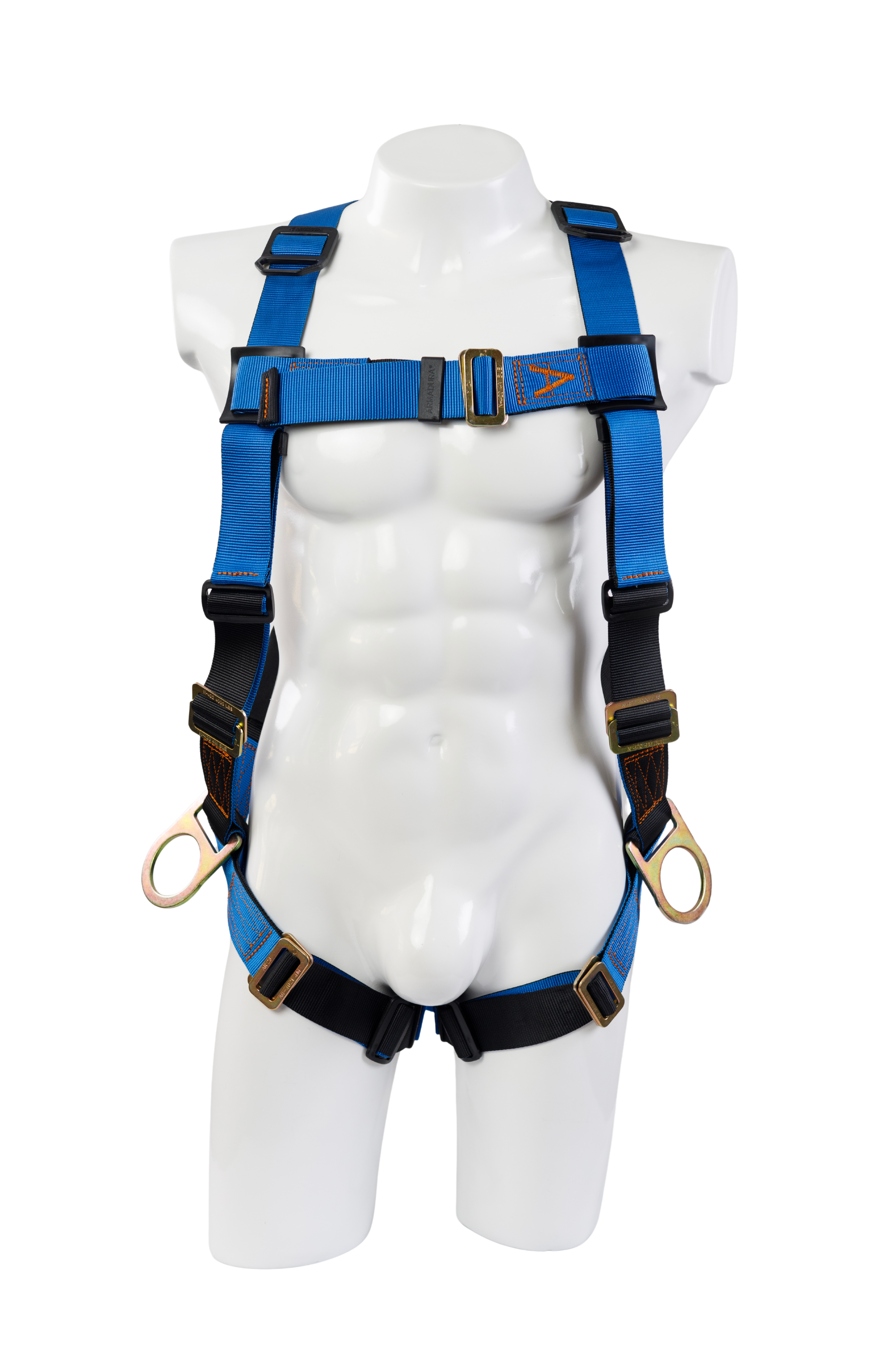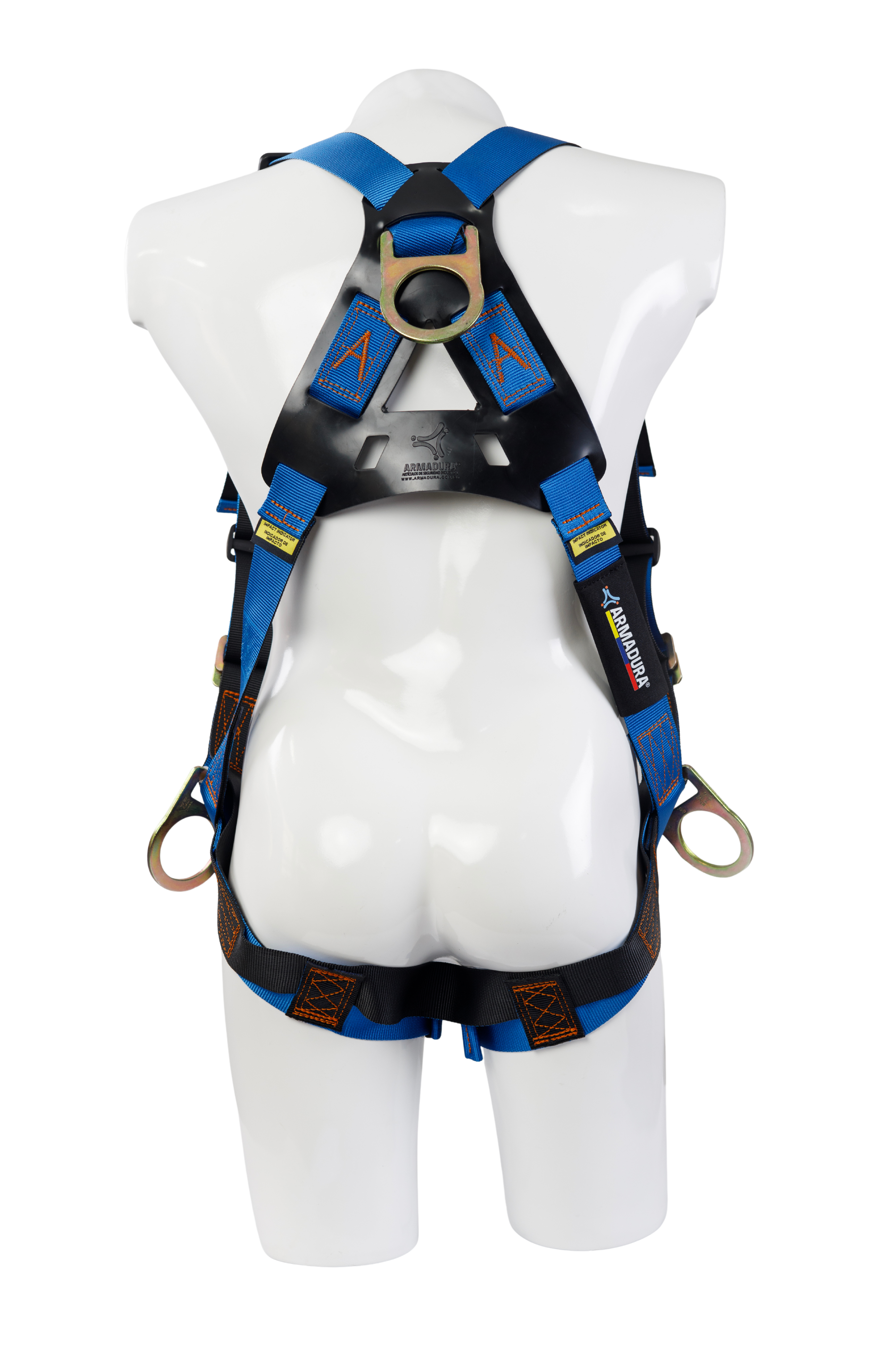 Arnés industrial cuerpo completo, parte de un sistema personal de detención de caídas, con diseño en H, certificado bajo las normas ANSI Z359.11 (2021) y cumpliendo con los lineamientos de la ANSI Z359.12 (2019); talla única, provisto de 3 argollas en acero forjado.