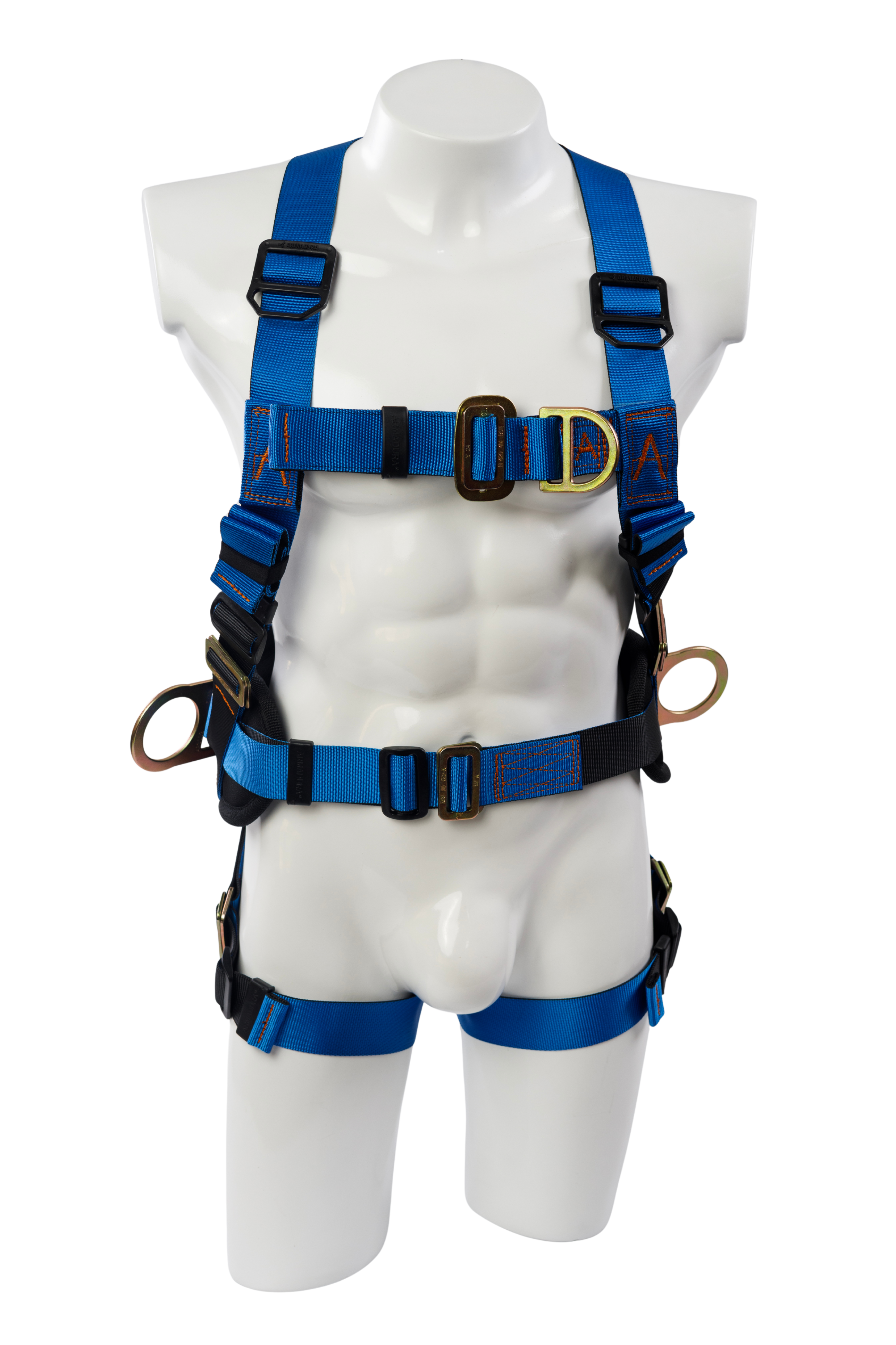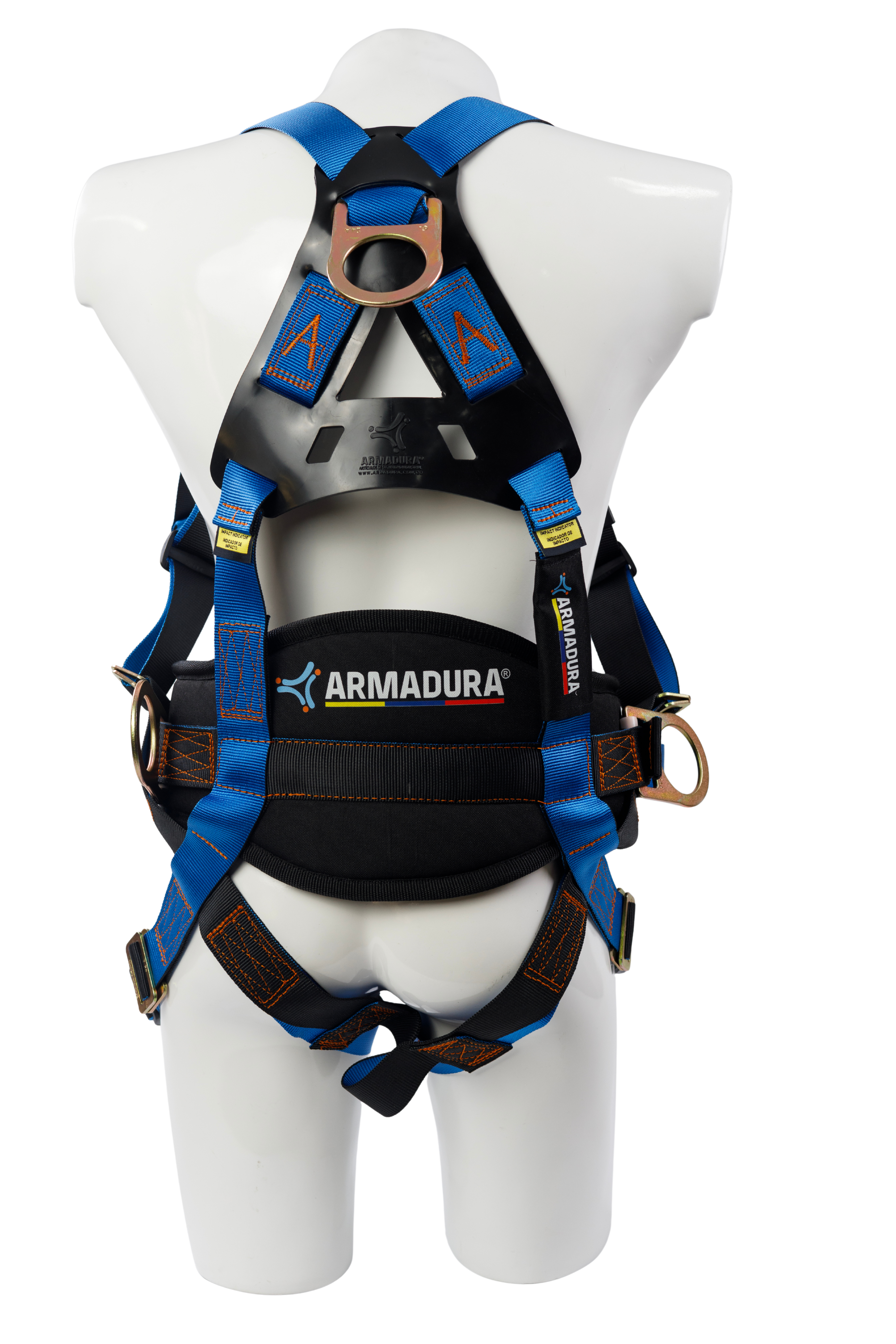 Arnés industrial cuerpo completo, parte de un sistema personal de detención de caídas, con diseño en H, certificado bajo las normas ANSI Z359.11 (2021) y cumpliendo con los lineamientos de la ANSI Z359.12 (2019); talla única, provisto de 4 argollas en acero forjado.